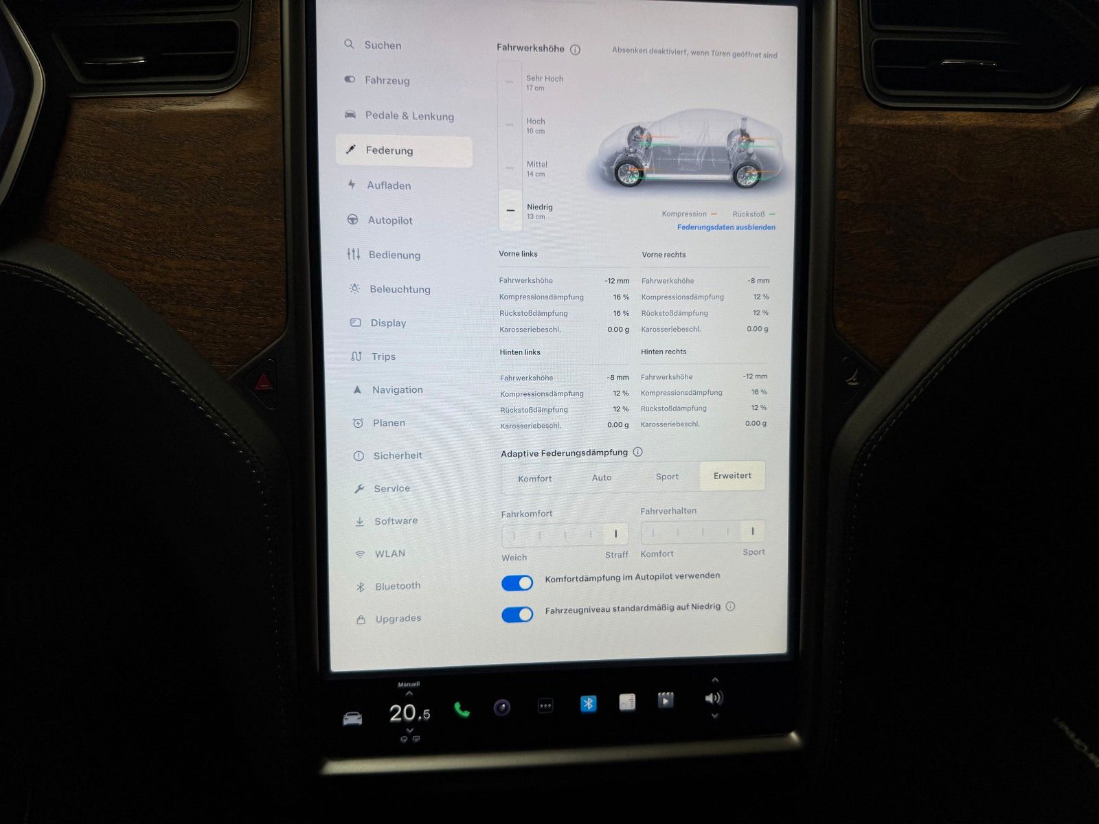 Adaptives Luftfahrwerk mit Einstellmöglichkeit für Härte und Dämpfung. Stetige Verbesserungen und Funktionalitäten durch Softwareupdates. Höhenverstellbarkeit bietet größere Bodenfreiheit auf schlechten Wegen und an steilen Rampen (Tiefgaragen) Automatisches Absenken für bessere Aerodynamik mehr Reichweite und stabilere Straßenlagebei hohen Geschwindigkeiten. Standortabhängiges automatisches Hochfahren bei unter 30 Km/h.