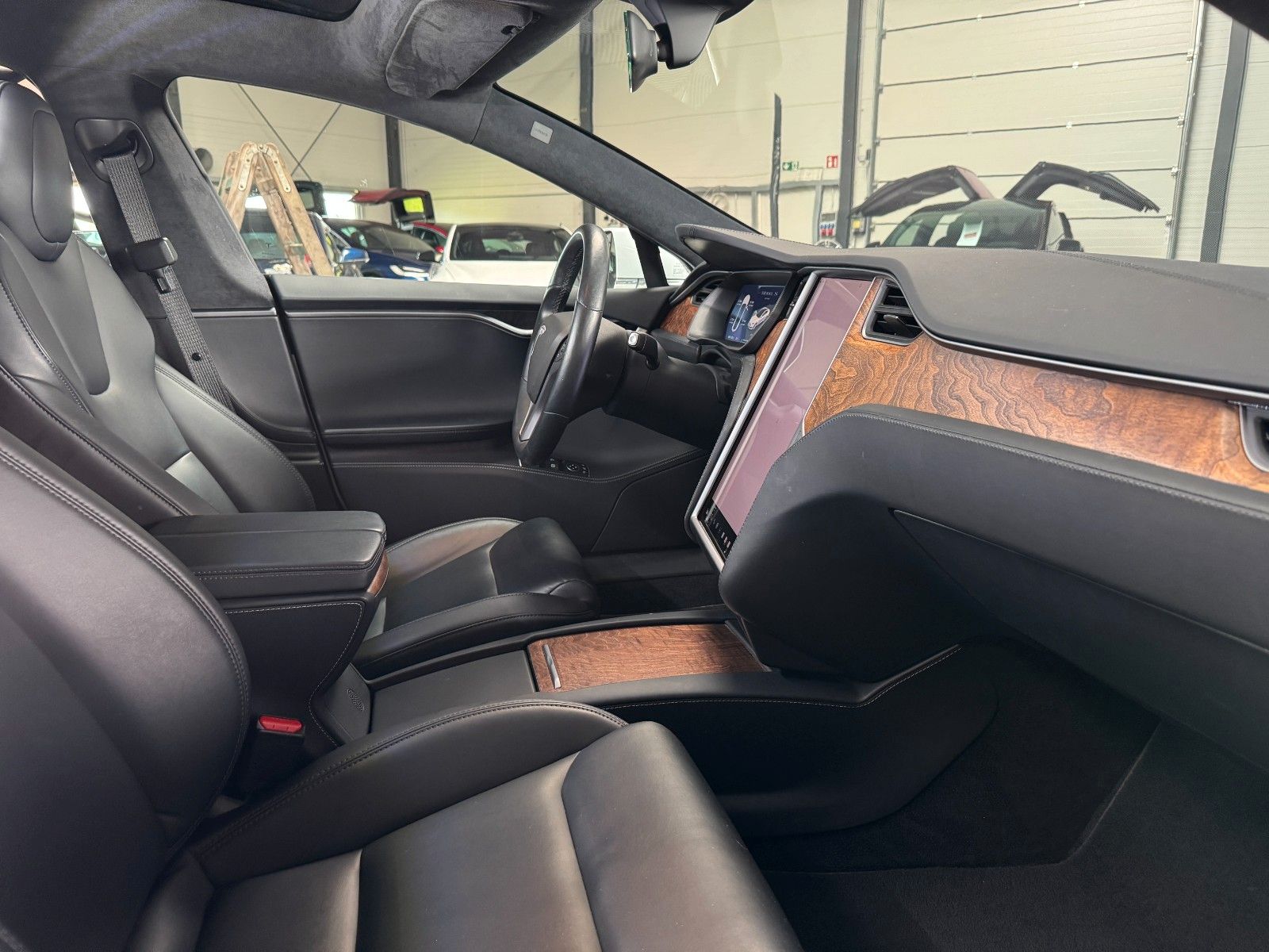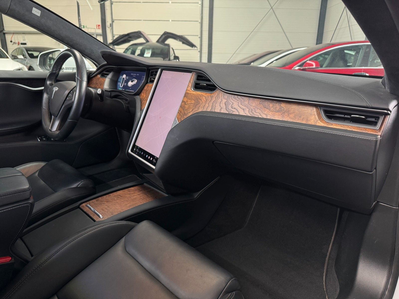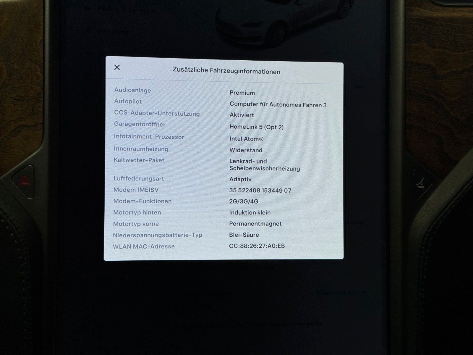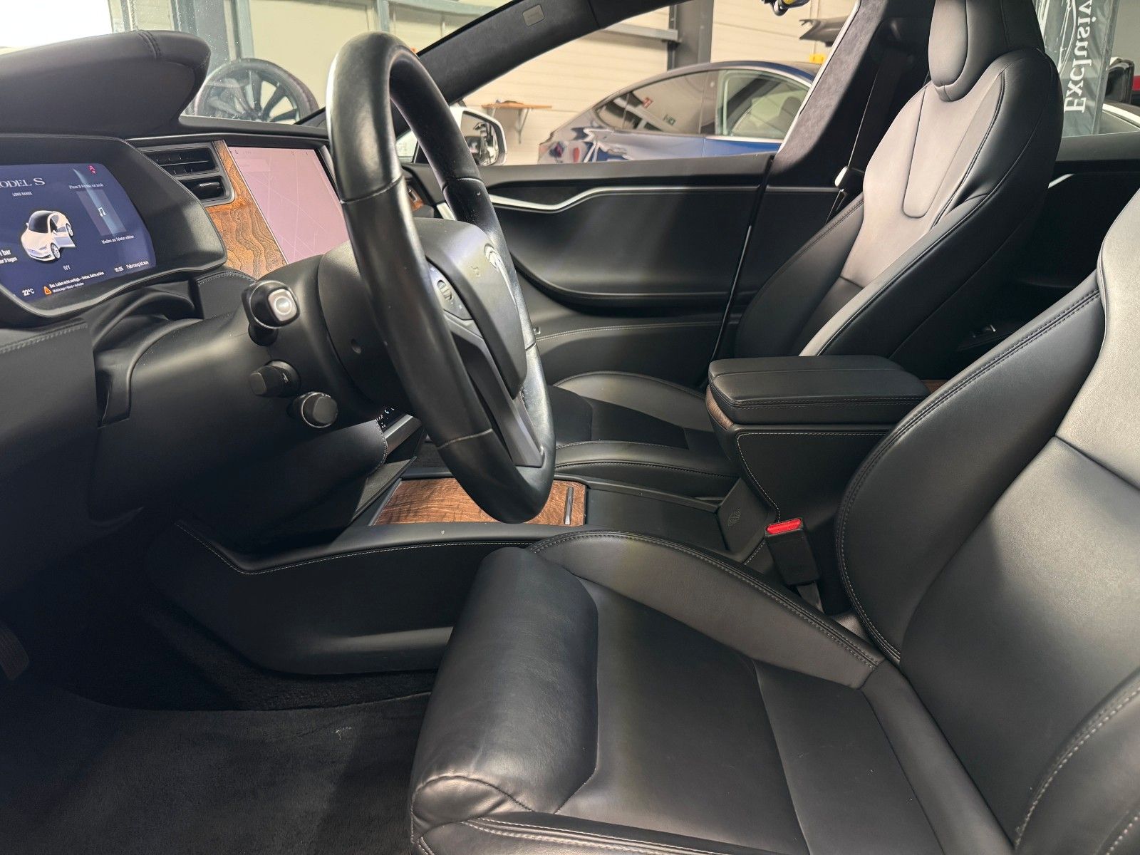 Tesla Model S 100 kWH Long Range Raven Ash Wood Decor Black Pur Tesla Designed Seats Pearl White Multi-Coat air filter + HEPA (high-efficiency particulate absorbing) air filter Autopilot Hardware 3.0 Full Self Drive aktiviert CCS Upgrade aktiviert MCU2 Intel Atom Prozessor Premium Sound Heated seats for every passenger, heated steering wheel, wiper blade defrosters and washer nozzle heaters Front Brake Brembo Black Raven Drive Unit App Bedienung u. ein Schlüssel LED Tagfahrlicht teilw. Funktion Premium Interior Lighting