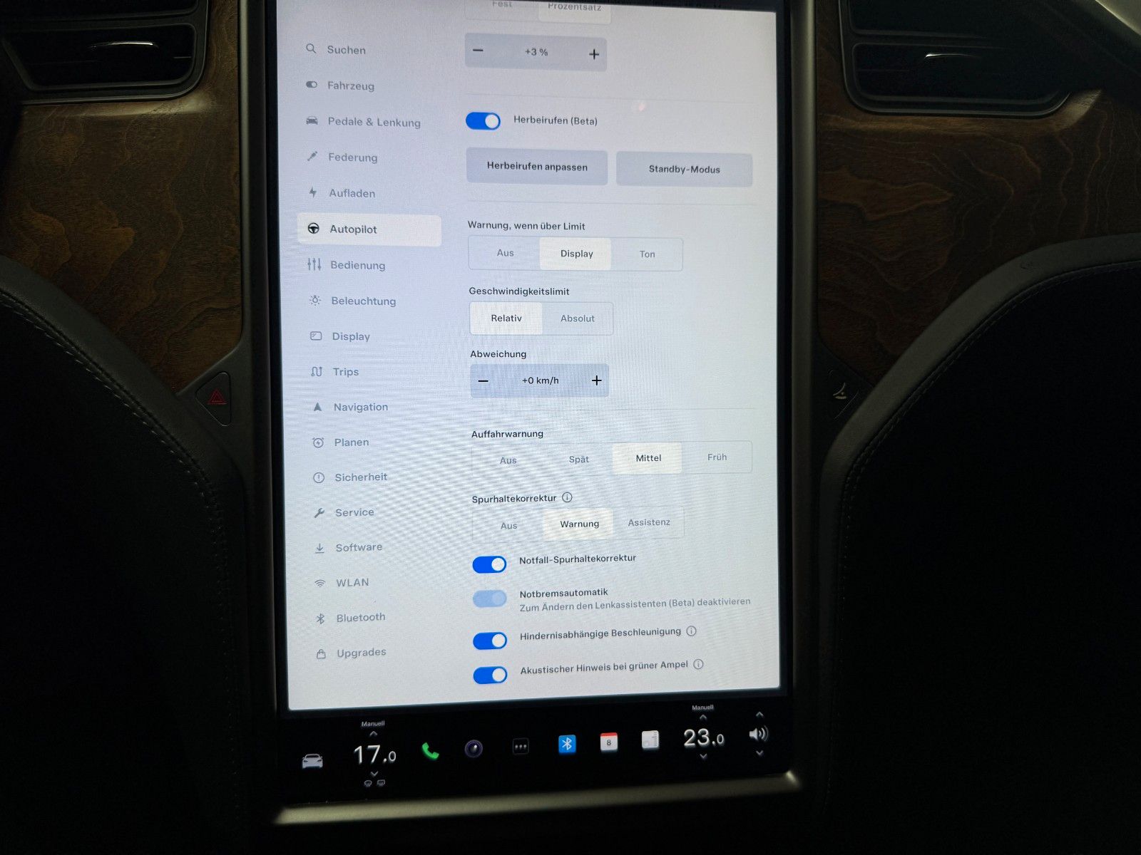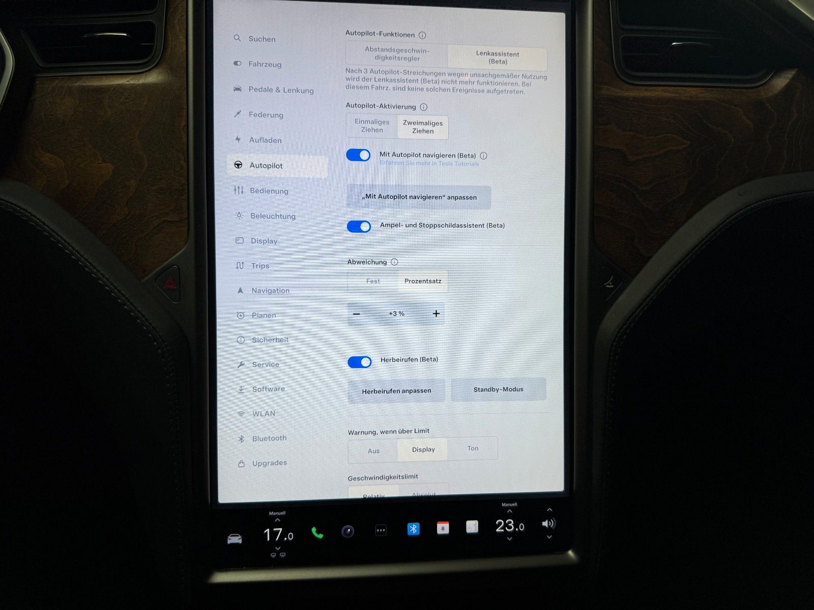 Spurhalteassistent mit automatischer Lenkung, Beschleunigung und Bremsung Lenkassistent (Beta) Mit Autopilot navigieren (Beta) Herbeirufen-Funktion (Beta) Ampel- und Stoppschildassistent (Beta) Akustisches Signal bei grüner Ampel Erweiterte Fahrdarstellung für autonomes Fahren Adaptiver Tempomat mit hindernisabhängiger Beschleunigung Verkehrszeichenerkennung Totwinkel-Kollisionswarnung Notfall-Spurhaltekorrektur Automatische Notbremsung AuffahrwarnungHinweis:Der Funktionsumfang des Autopiloten kann gemäß den Tesla-Richtlinien sowie den gesetzlichen Bestimmungen der jeweiligen Länder – insbesondere innerhalb der EU – variieren.