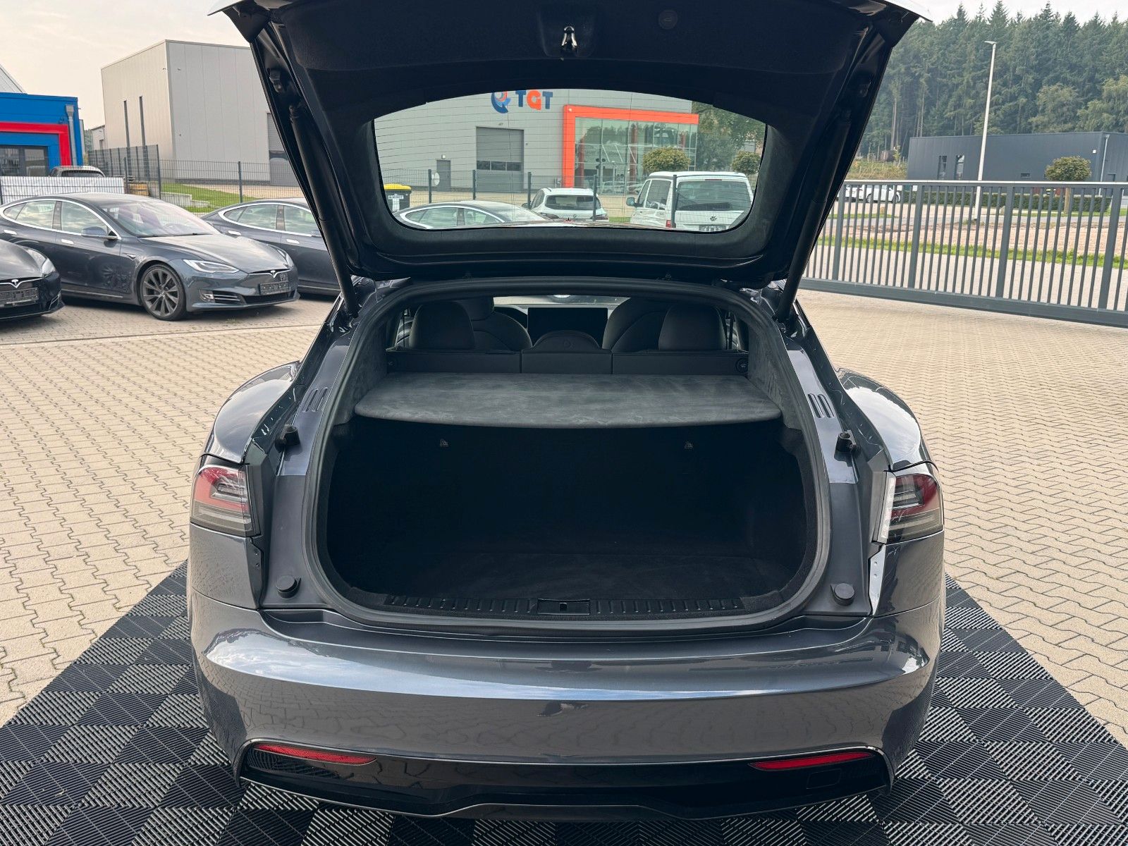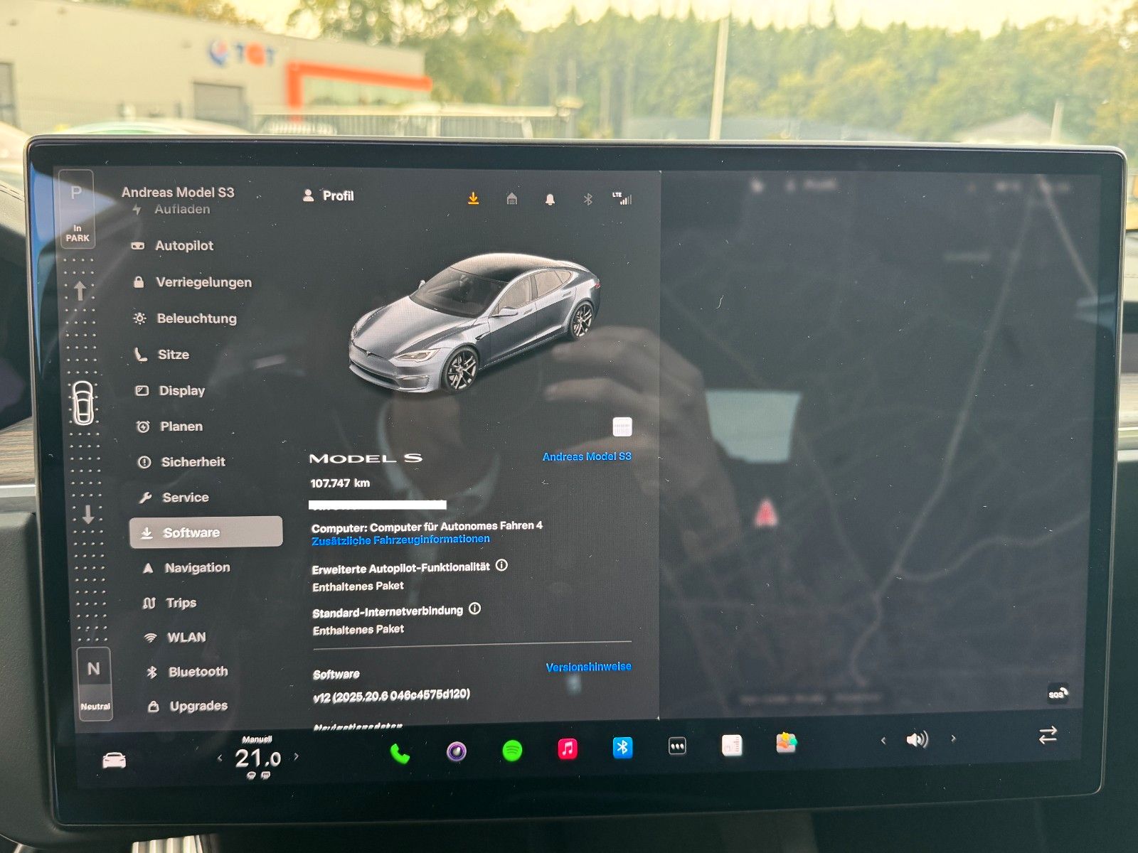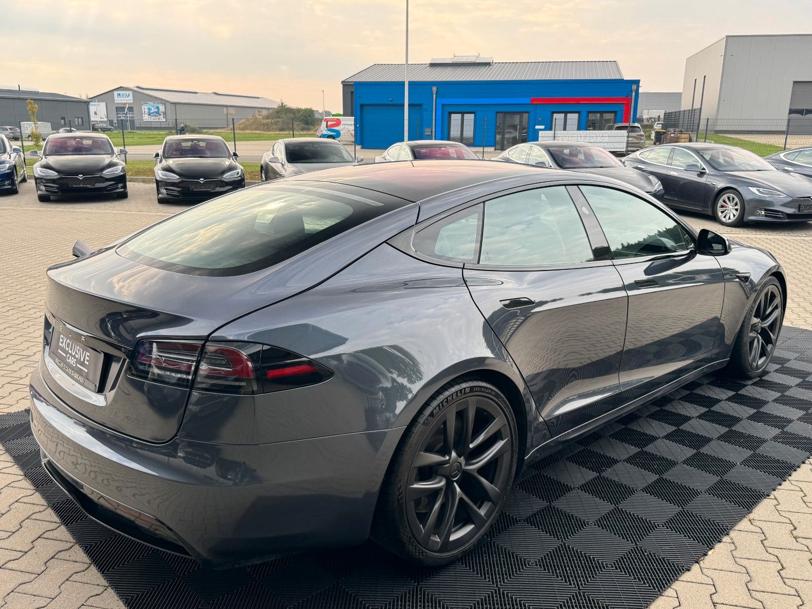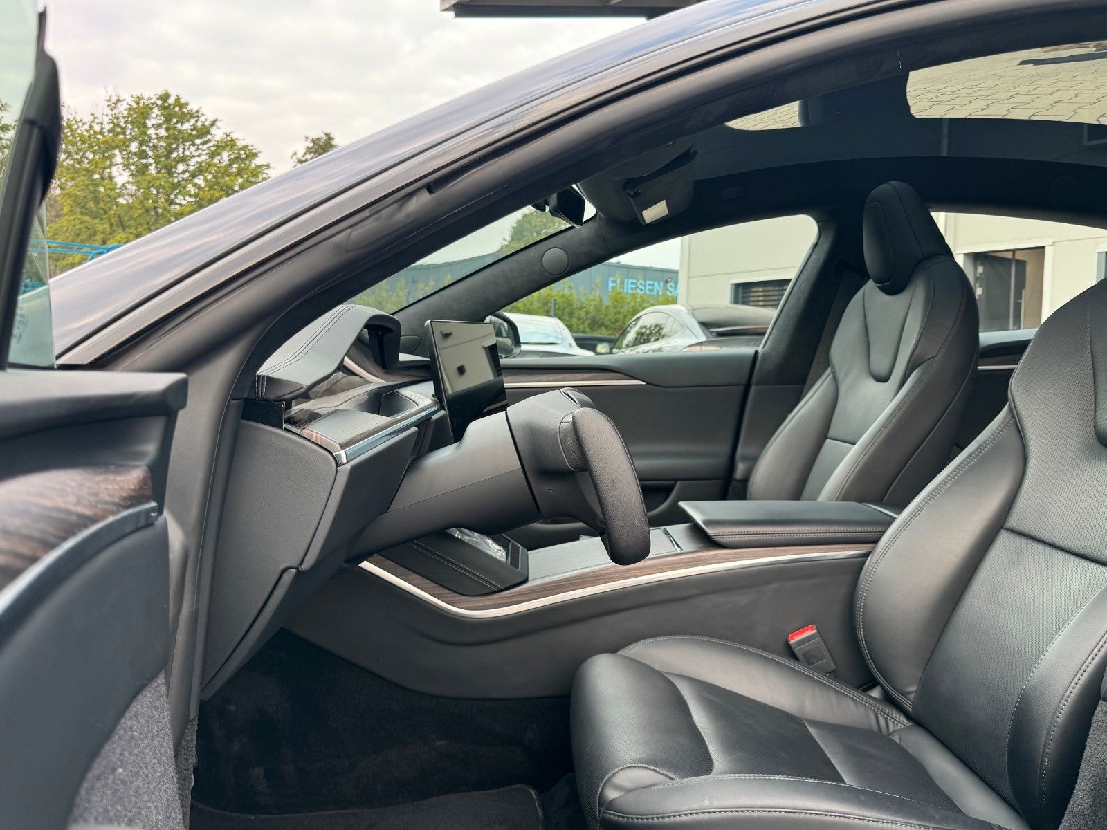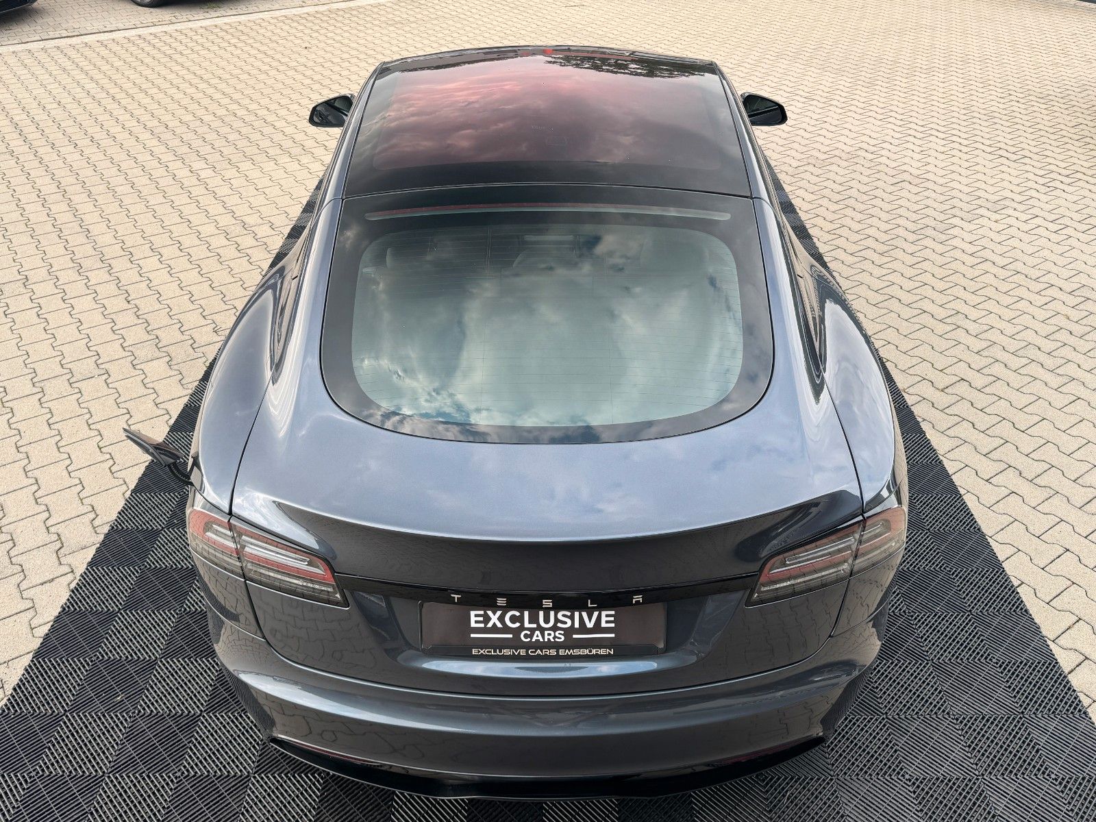 Tesla Model S Long Range Palladium Dual Motor Midnight Silver Metallic PUR Black Colorway Ebony Wood Decor 21 Zoll Archanid Felgen Yoke Steering Autopilot Hardware 4.0 mit Enhanced Autopilot air filter + HEPA (high-efficiency particulate absorbing) air filter AMD Ryzen High End Prozessor Premium Sound Heated seats for every passenger, heated steering wheel, wiper blade defrosters and washer nozzle heaters, Seat Ventilated Front Brake Brembo Black Premium Interior Lighting Glass Roof Suspension Update Palladium