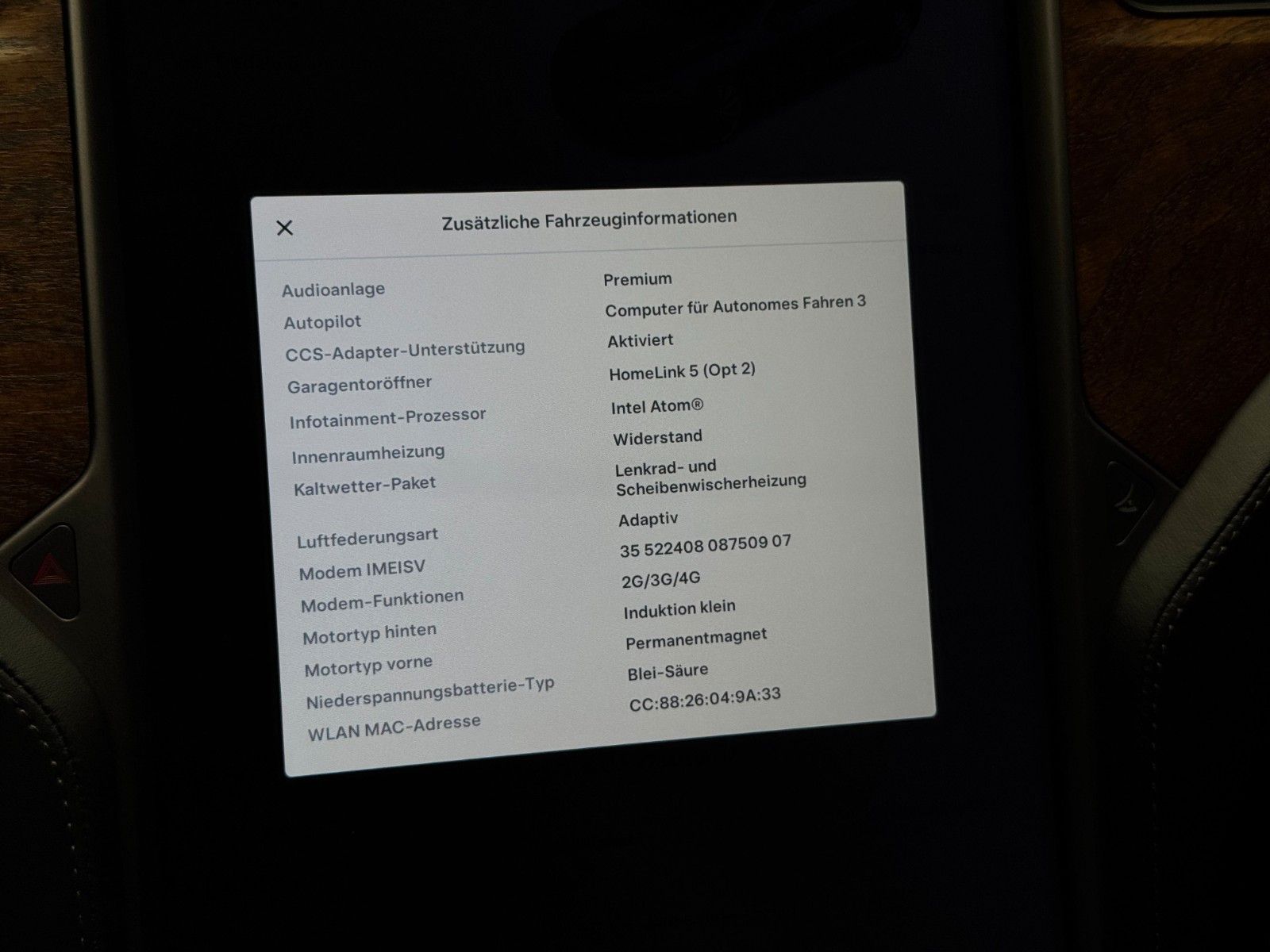 air filter + HEPA (high-efficiency particulate absorbing) Autopilot Hardware 3.0 Premium Sound CCS Upgrade MCU2 Intel Atom 2 Mando Black Brake Calipers Heated seats for every passenger, heated steering wheel, wiper blade defrosters and washer nozzle heaters LED teilw. Funktion PUR Dash Pad Active Hood Raven Drive Unit Figured Ash Wood Decor Premium Interior Lighting Black PUR Premium Lower Trim w/ Black IP Midnight Silver Metallic Glass Roof 21" Sonic Carbon Twin Turbine Wheels Suspension Update Black Ultra-Suede Upper Trim Headliner