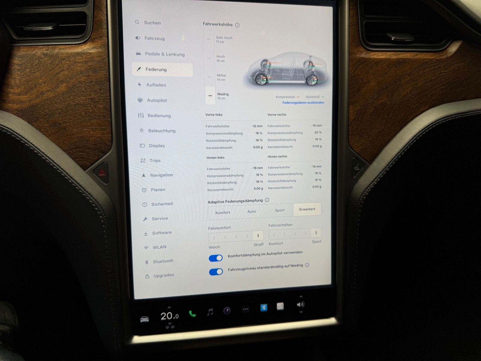 Adaptives Luftfahrwerk mit Einstellmöglichkeit für Härte und Dämpfung. Stetige Verbesserungen und Funktionalitäten durch Softwareupdates. Höhenverstellbarkeit bietet größere Bodenfreiheit auf schlechten Wegen und an steilen Rampen (Tiefgaragen) Automatisches Absenken für bessere Aerodynamik mehr Reichweite und stabilere Straßenlagebei hohen Geschwindigkeiten. Standortabhängiges automatisches Hochfahren bei unter 30 Km/h.