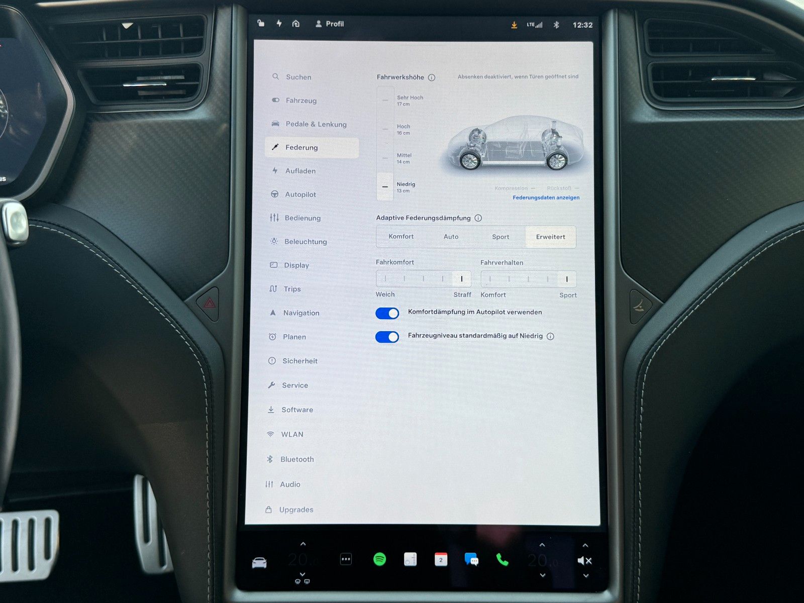 Adaptives Luftfahrwerk mit Einstellmöglichkeit für Härte und Dämpfung. Stetige Verbesserungen und Funktionalitäten durch Softwareupdates. Höhenverstellbarkeit bietet größere Bodenfreiheit auf schlechten Wegen und an steilen Rampen (Tiefgaragen) Automatisches Absenken für bessere Aerodynamik mehr Reichweite und stabilere Straßenlagebei hohen Geschwindigkeiten. Standortabhängiges automatisches Hochfahren bei unter 30 Km/h.