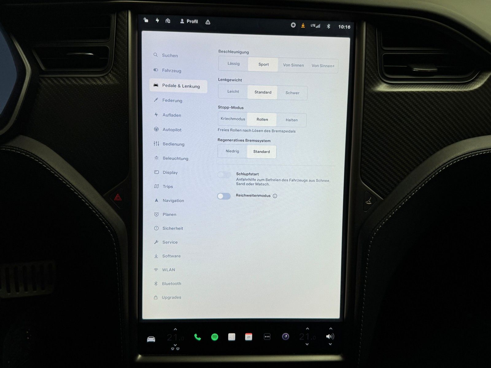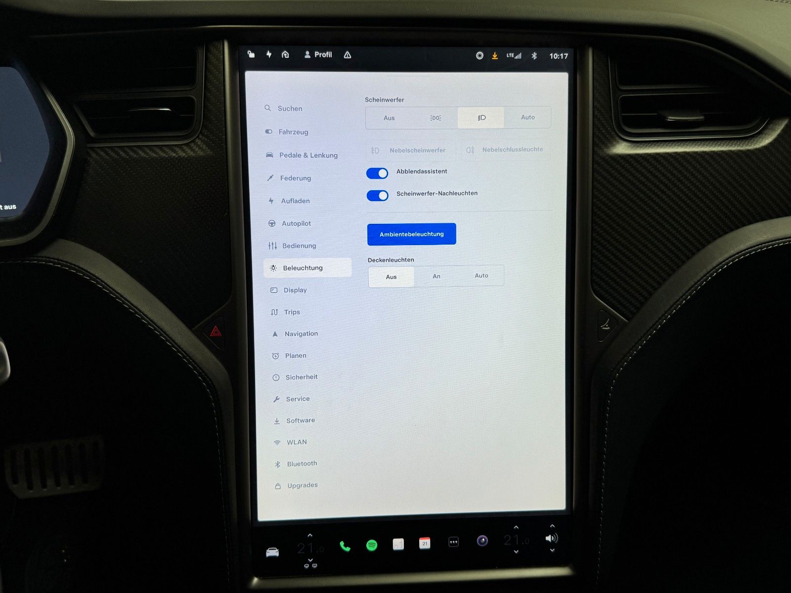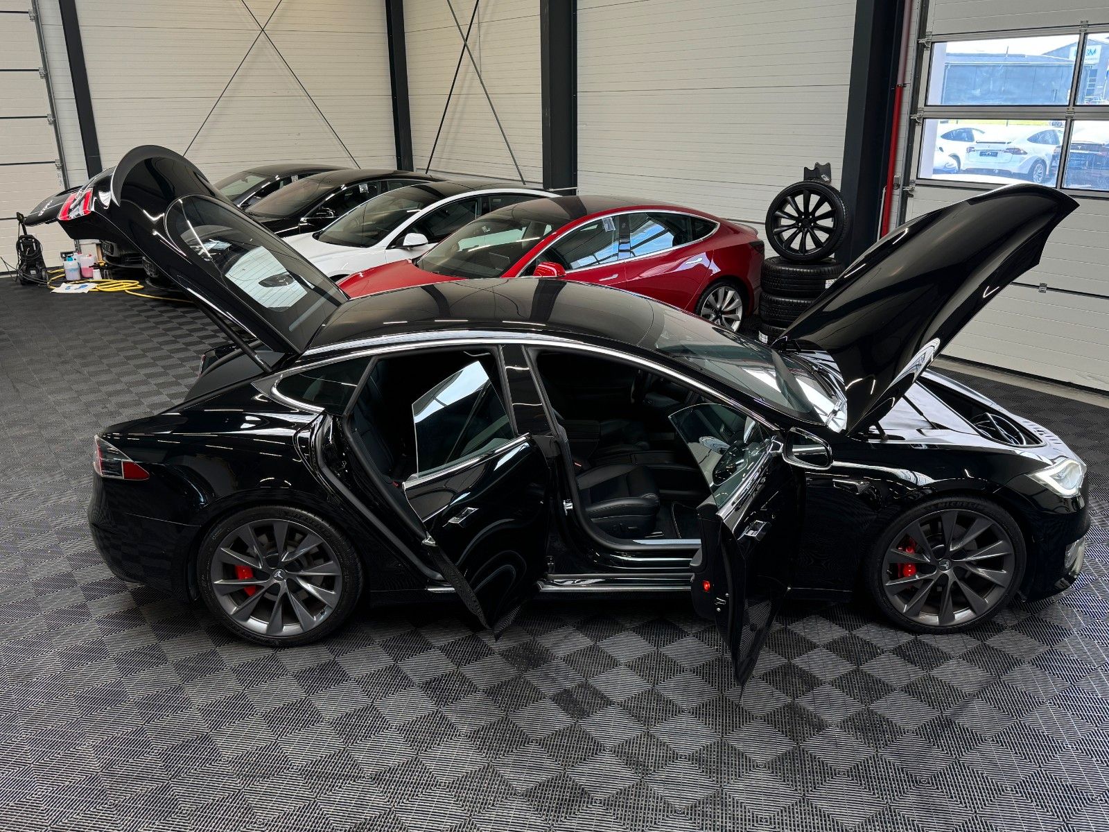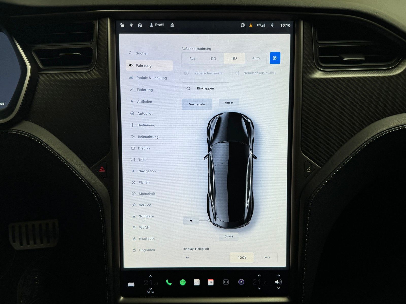 air filter + HEPA (high-efficiency particulate absorbing) air filter Autopilot Hardware 3.0 Full Self Drive Upgrade aktiviert CCS Upgrade aktiviert MCU2 Intel Atom Upgrade aktiviert Premium Sound Heated seats for every passenger, heated steering wheel, wiper blade defrosters and washer nozzle heaters Active Hood Front Brake Brembo Black Performance Drive Unit Carbon Fiber Spoiler Carbon Fiber Decor LED Tagfahrlicht teilw. Funktion Premium Interior Lighting Black PUR Designed Premium Seats Solid Black 21" Sonic Carbon Twin Turbine Wheels Glass Roof Suspension Update app Bedienung u. ein Schlüssel