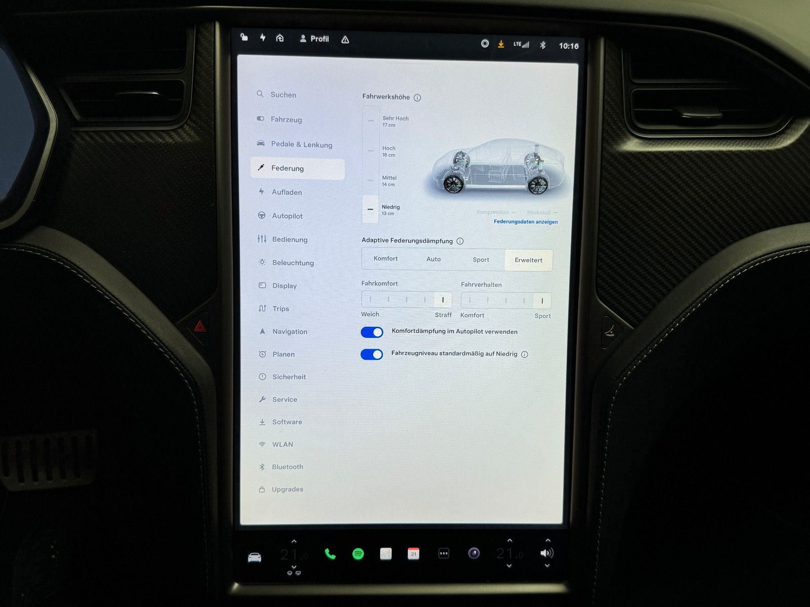Adaptives Luftfahrwerk mit Einstellmöglichkeit für Härte und Dämpfung. Stetige Verbesserungen und Funktionalitäten durch Softwareupdates. Höhenverstellbarkeit bietet größere Bodenfreiheit auf schlechten Wegen und an steilen Rampen (Tiefgaragen) Automatisches Absenken für bessere Aerodynamik mehr Reichweite und stabilere Straßenlagebei hohen Geschwindigkeiten. Standortabhängiges automatisches Hochfahren bei unter 30 Km/h.