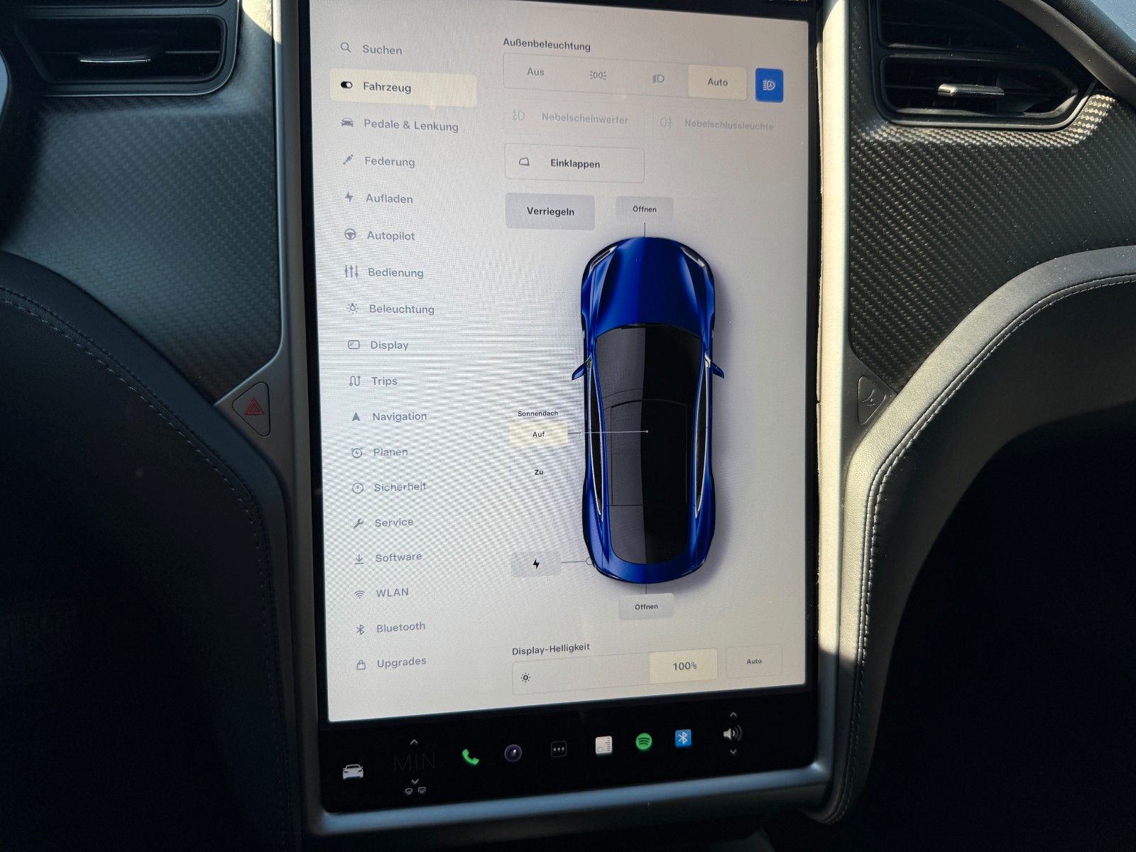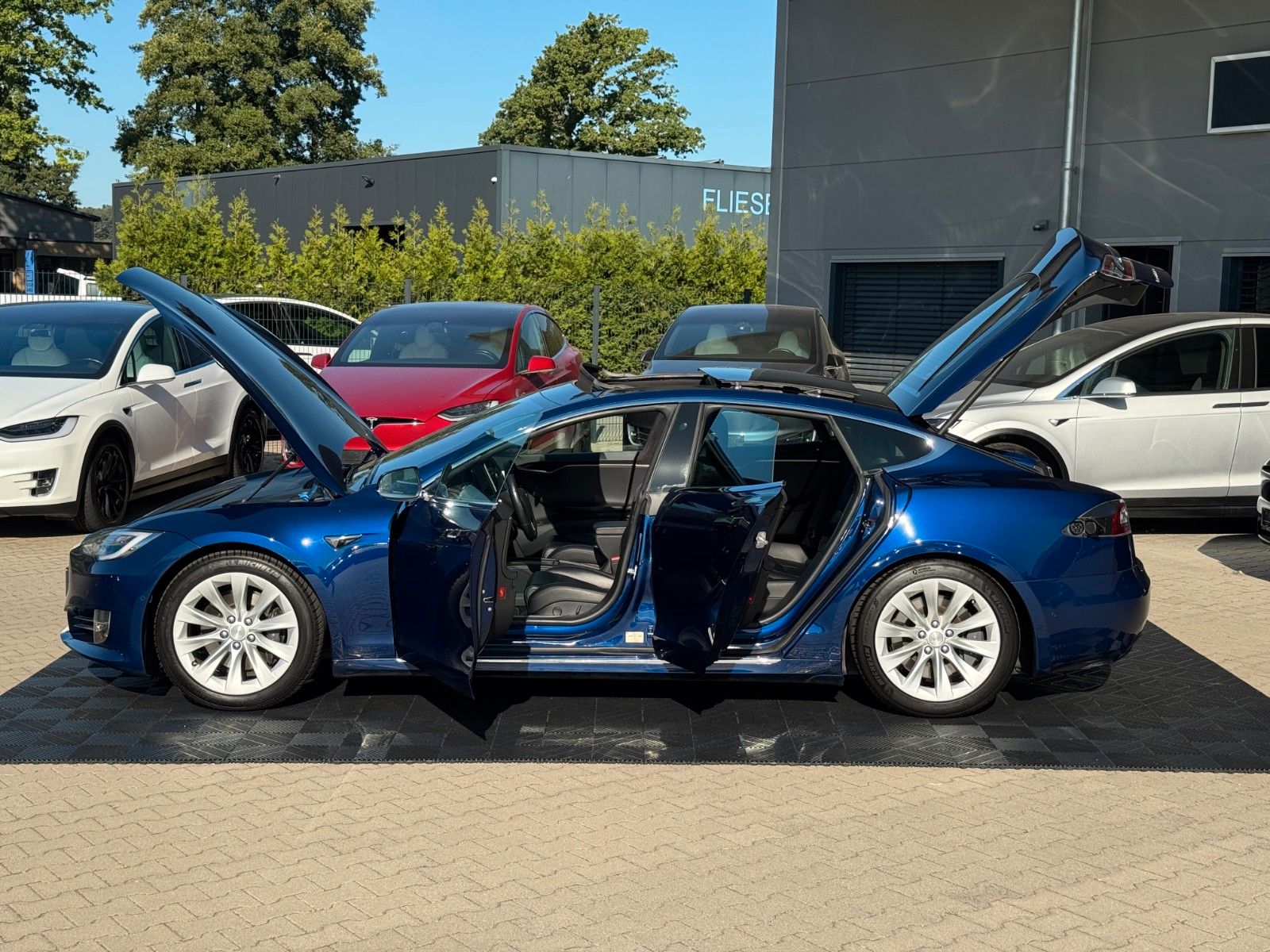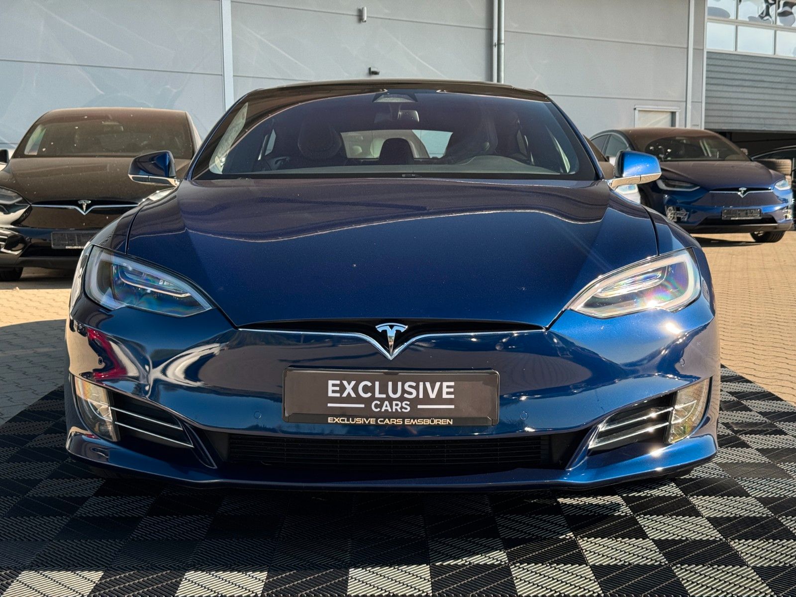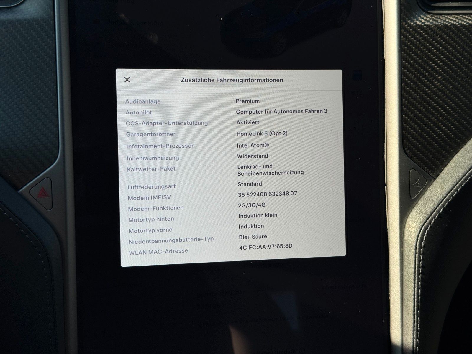 Tesla Model S 75D Dual Drive Deep Blue Metallic Carbon Fiber Decor Diamond Black Metallic Paint Glass Roof Sunroof MCU 2 Intel Atom Upgrade Black PUR Premium Lower Trim w/ Black IP Autopilot Hardware 2.5 + PASCAL ECU + Autopilot Hardware 3.0 Mando Black Brake Calipers air filter + HEPA (high-efficiency particulate absorbing) air filter Premium Interior Lighting Black Ultra-Suede Upper Trim Headliner LED Tagfahrlicht teilw. Funktion app Bedienung u. ein Schlüssel Smart Air Suspension Heated seats for every passenger, heated steering wheel, wiper blade defrosters and washer nozzle heaters 19" Silver Wheels