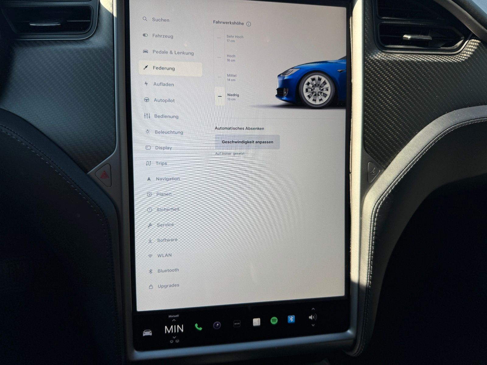 Tesla Smart Air Suspension Luftfederung Höhenverstellbarkeit bietet größere Bodenfreiheit auf schlechten Wegen und an steilen Rampen (Tiefgaragen). Automatisches Absenken für bessere Aerodynamik (mehr Reichweite und stabilere Straßenlage) bei hohen Geschwindigkeiten. Optischer Unterschied mit Einstellung „tief“ und großen Felgen. Die Tesla Luftfederung bringt einen minimalen Verbrauchsvorteil von etwa 1-2%. Standortabhängiges automatisches Hochfahren (bei unter 30 Km/h).