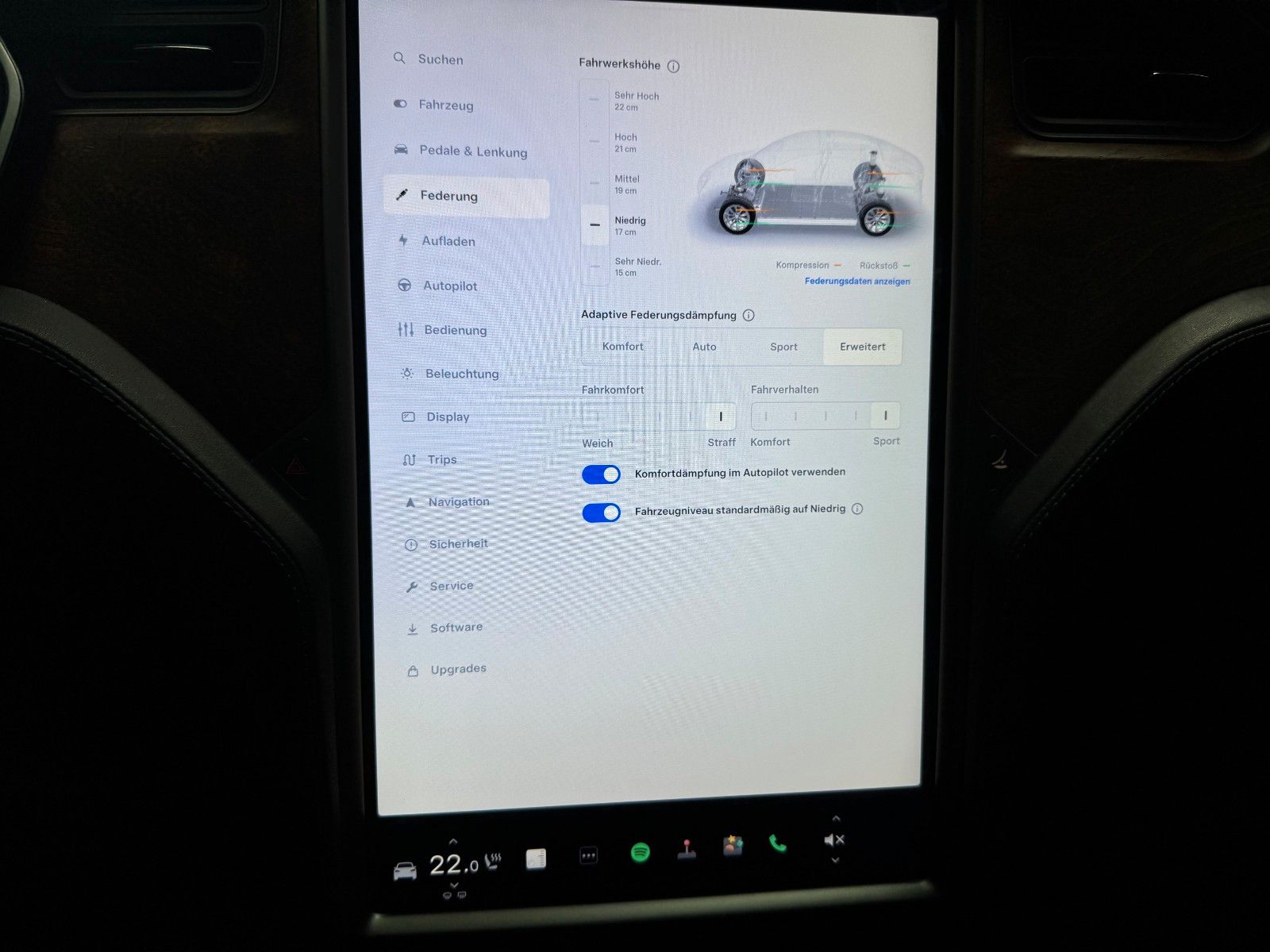 Adaptives Luftfahrwerk mit Einstellmöglichkeit für Härte und Dämpfung. Stetige Verbesserungen und Funktionalitäten durch Softwareupdates. Höhenverstellbarkeit bietet größere Bodenfreiheit auf schlechten Wegen und an steilen Rampen (Tiefgaragen). Automatisches Absenken für bessere Aerodynamik (mehr Reichweite und stabilere Straßenlage) bei hohen Geschwindigkeiten. Optischer Unterschied mit Einstellung “tief” und großen Felgen. Die Luftfederung bringt einen minimalen Verbrauchsvorteil von etwa 1-2%. Standortabhängiges automatisches Hochfahren (bei unter 30 Km/h).